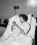 It was visiting time at Harris Hospital, and Mrs. F. B. Zimmermann, top left, cuddled her daughter, Eddie Layne, while Mrs. E. B. Zimmermann, right, smiled at her Gail Eddie. Later F. B. Zimmermann, lower left, went home and told his 4 year old son, Mark, all about his new sister. E. B. Zimmermann, right, reported to his 5 year old son, also named Mark. The Zimmermanns are not related and didn't know each other until after the births of Gail Eddie, Tuesday night, and Eddie Layne, Wednesday morning. In the picture Mrs. E. B. Zimmermann with daughter Gail Eddie.