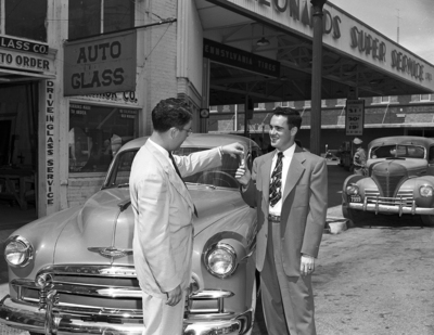 Paul Leonard, left, one of the owners of Leonard's Department Store, presents keys to a new car awarded Harry Ottman, of 1333 Woodland, as first prize in a Tarrant County census estimating contest conducted by the store. Published in Fort Worth Star-Telegram morning edition June 29, 1950.