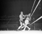 Al Gonzales, left, representing Odessa, wades in against Jimmy Deliganes of San Antonio in a light heavyweight quarterfinals scrap. Gonzales battered out a decision over his shorter foe to gain berth in Monday's semifinals.