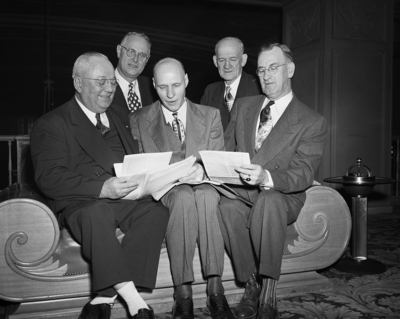 Representing various phases of traffic discussions held during the last three days are these five men, posed in a huddle at Hotel Texas. Left to right, seated are T. M. Spence, Houston, chairman of railroad contact committee for the Southwest Shippers Advisory Board; C. C. Dehne, Stuttgart, general chairman, SSAB, and Paul T. Jackson, president Southwestern Industrial Traffic League. Behind them are Robert M. Duke, left, president, Fort Worth Traffic Club, and Ed P. Byars, manager, Chamber of Commerce Traffic Bureau, both of Fort Worth.