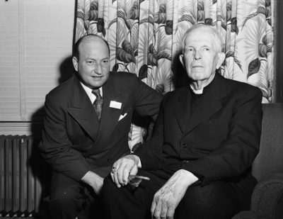 Figuring in ceremony formally establishing a Serra Club of Fort Worth, here are Reverend Joseph P. Lynch, bishop of Dallas, right, and Frank E. Crumley, president. Published in Fort Worth Star-Telegram morning edition June 29, 1950.