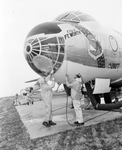 Convair employees C. W. Brown left, and J. H. McGregor braved the chilling wind at Carter Field Saturday to apply soap and water to the B-36 "The City of Fort Worth". The big bomber is being readied for public exhibition as a memorial to the men and women who built it.