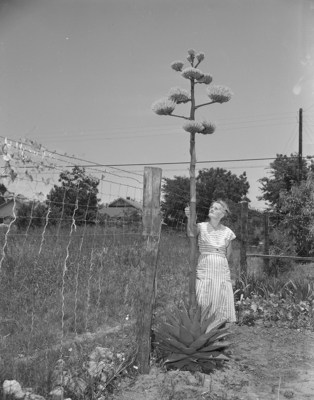 Fifteen years ago, Mrs. Beulah Hurst, wife of Mr. W. L. Hurst bought a small "cactus" plant for 75 cents and set it out at her home, 2612 Azle Avenue. The century plant now is 10 feet high, has a four-inch-thick stem, and pleases Mrs. Hurst, who is shown with it above. Published in Fort Worth Star-Telegram evening edition, June 29, 1950.