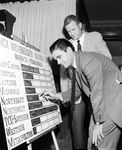 Al White, chairman of the Northwest YMCA Branch campaign workers, checks 1959 goals as Northeast Chairman Pat Moffatt looks on. Both are determined to take thier teams over the top by Thursday night.