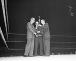 Gene Sunderland, left, athletic director at the University of Corpus Christi, accepts Golden Gloves team trophy from Bob Bethea, right, tourney trophy chairman. Center is Dan Coates. The men are standing in a boxing ring.