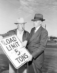That is the plea of county commissioners who have asked the public co-operation in catching gun vandals who shoot up road signs, such as this one exhibited by Precinct Commissioner Wright, right, and Charlie Smith, supervisor. Damaging signs is a criminal offense, they warned.