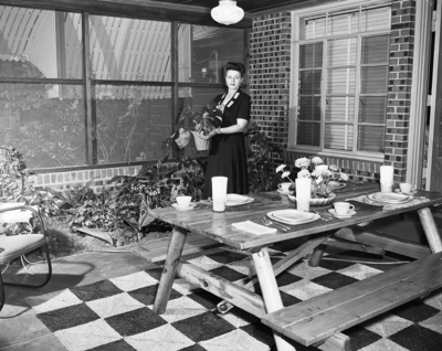 Here is an example of outdoor living with indoor comforts on a large screened-in porch at the home of Judge and Mrs. Earl P. Hall, 3709 Cresthaven. Mrs. Hall is shown arranging plants in the indoor plant bed. Published in Fort Worth Star-Telegram morning edition, July 2, 1950. A woman in a greenhouse holding a pot wearing a black suit like dress. There is a wooden decorative table she is standing behind and flowers on the floor behind her and a lawn chair.