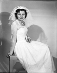 The marriage of Miss Rita Middlebrook and Larry Miller took place in Morningside Christian Church after home of the bride's parents, Mr. and Mrs. Roy Middlebrook, 1224 East Jefferson. Mr. and Mrs. Robert Laroy and Eula Eleanor Miller, 4929 Penrose, are parents of the bridegroom. Published in Fort Worth Star-Telegram morning edition, July 2, 1950. A woman in a wedding dress sitting or learning on something smiling.