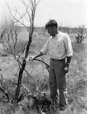 Image shows C. E. Fisher, Spur Experiment Station, checking the effects of 2, 4, 5-T brush killer in a test pasture. He is standing beside a mesquite tree. Published in the Fort Worth Star-Telegram morning edition, August 6, 1950.
