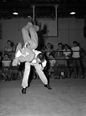 Image shows wrestling between two people. One is shown to be in the air, Paul Mallon, and Joe Morgan. They are wrestling at the Panther Boys Club. Published in the Fort Worth Star-Telegram morning edition, July 2, 1950.