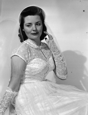 Image shows Mrs. Frank Walker Jr. in her wedding dress posed. Mrs. Virginia Murphy, daughter of Mr. and Mrs. J. A. Murphy, 2221 Harris Lane and Frank Walker Jr., Wichita Falls were married at Mr. and Mrs. Morris home at Stripling, 2117 S. Jennings. The bride is shown wearing a white satin and marquisette frock with long white lace gloves and a white summer velvet hat with short veil. Rev. Ike Sidebottom married the couple. The brides sister, Mrs. E. W. Toomey attebded the bride and Robert Bounds was best man. Published in the Fort Worth Star-Telegram morning edition, July 2, 1950.