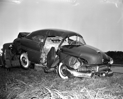 Image shows a car that that is being pulled by a tow truck. The car belonged to a family of three that drowned when they rolled from State Highway 114 between Roanoke and Rhome. In the care were Allen L. Lumpkin, his wife and 3 year old son from Montgomery, Alabama. Published in the Fort Worth Star-Telegram morning edition, June 30, 1950.