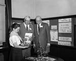 Sherry Lynn Byrd, a fifth grade student at Stephen F. Austin, explains a bulletin board exhibit at her school to two of the first visitors during Public Schools Week. members of a tour sponsored by the Chamber of Commerce, they are Business Men J. E. Fender, left, and Johnnie Johnson.