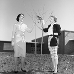 Mmes. E. L. Baker Junior, left, and Ralph N. Vinson happily discover budding leaves on one of the mulberry trees their club, Wedgwood Garden Club, planted in January on the grounds of the new Bruce Shulkey Elementary School. Mrs. Baker is president and Mrs. Vinson, projects chairman, of the year-old Wedgwood club.