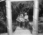 Gregory Rawlins, a summer day camper at Camp Carter, opens the camp's new "Friendship Bridge" as Noval P. Roach, who designed and supervised its building, looks on. Ready to make a first crossing are Mike Ritchey, Cordell Green and Jeff Haley, second row left to right; Wright Howington and B. L. Brady, third row, and Jimmy Shelton and Jimmy Carter, rear . Published in Fort Worth Star-Telegram, evening edition June 30, 1950.
