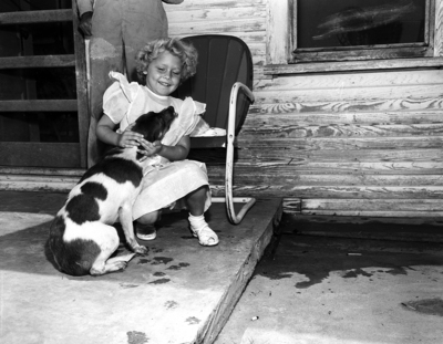 Image shows Sandra Jean Mullins on porch holding her dog, Tinker. Lone survivor of crash has new mother and dog. Sandra Jean survived a car-train crash in 1949, killing 3 including her mother, brother and cousin in the car at the lower Birdville Road crossing.