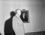 W. M. Sherley of Lazbuddie, Parmer County, stands near portrait of his father, Andrew Sherley, for whom new women's dormitory at TCU is named. Sherley recently presented the painting to the dormitory, which will be dedicated Thursday.