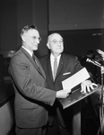 Dr. Harvie Branscomb, chancellor of Vanderbilt University, left, and Dr. M. E. Sadler, TCU president, exchange views as four buildings are dedicated at a luncheon on the TCU campus.