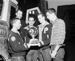 The Pampa Harvesters who Saturday won the state 4A basketball championship, spent Sunday night at the Worth Hotel and took time to show off their trophy. From left are Charles Mino, Coach Clifton McNeely, Bobby Gindorf, Mack Layne, and Coyle Winborn.