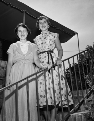 Image shows Miss Betty Beavers, left and Miss Jeanne Buisson, right standing outside on stairs. Buisson is a house guest of Beavers and her parents Dr. and Mrs. G. Herbert Beavers, 46 Valley Ridge Rd. They are both schoolmates at Penn Hall Junior College. Published in the Fort Worth Star-Telegram evening edition, July 3, 1950.