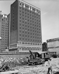 It's only the camera's trick. Excavators are not digging under foundations of Hotel Texas, as photograph seems to indicate. The big pit, from which 30,000,000 pounds of dirt and rock will be removed, is for foundations of new Fort Worth National Bank Skyscraper, across Main St. from hotel. Published in Fort Worth Star-Telegram, evening edition July 4, 1950.