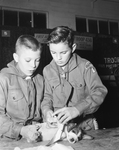 Showing what they've learned about first aid, Tommy Allen, left, and Mike Held, both of Scout Troop 13, Benbrook, do a job on the dog, Princess, during Friday night's session of the two-day Scout-O-Rama in the Will Rogers Exhibits Building. The show, attended by more than 12,000 persons Friday night, will be presented again from 6:30 to 9:30 p. m. Saturday.
