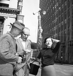 Hugh Carwile, left, and C. J. Raven, both of the Weather Bureau's regional office, gauged the wind at 35 m. p. h. at 2:25 p. m. Friday on the corner of Houston and 7th, but Mrs. Nell Jackson of 7312 Oakland Lane doesn't need a gauge to know its windy as she tries to manage her hair.
