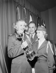 Captain W. G. Albert, Air Force ROTC adviser at TCU, center and Miss Charlotte Johnson congratulate Cadet Captain Richard W. LaBoon of the TCU Grenadiers, who holds trophy won by Grenadiers in drill team competition at TCU Saturday. Miss Johnson is the Grenadier sweetheart.
