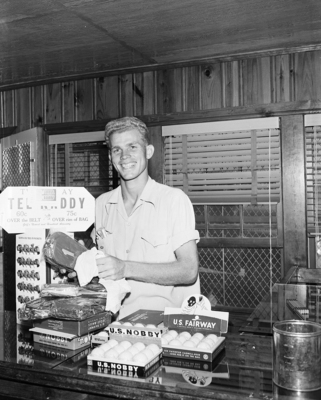 Pro Douglas Higgins applies final polish to golf equipment at Z Boaz golf course which will be formally open with a special program. Published in Fort Worth Star-Telegram evening edition July 1, 1950.
