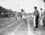 University of Texas' Eddie Southern takes baton from Drew Dunlap for final lap of the university division mile relay in the Southwestern Recreation meet. John Emmett of SMU's second place team awaits handoff.