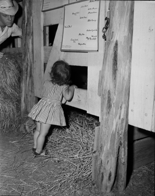 Martha Rollins, 22-month-old daughter of Mr. and Mrs. G. W. Rollins of Stamford, is shown peeping through a gate at the Quarter horse barn at the Texas Cowboy Reunion grounds at Stamford. Published in Fort Worth Star-Telegram, evening edition July 1, 1950.