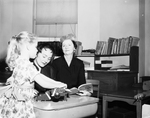 Textbooks in braille. Kay Rogers, blind first grader with Mrs. H. E. Cunningham, and mother Mrs. Juanita Rogers.