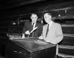Frontier schoolroom. O. H. Stowe, and Joe Moore examine a school desk of 1820's.