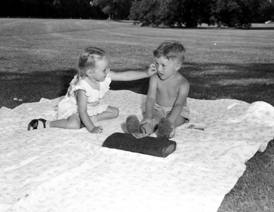 Image shows two children at a family picnic at Forest Park. From left to right, three year old Candace Thompson, daughter of Mr. and Mrs. E. B. Thompson, 630 Chelsea. Candace feeds Michael Palmer, 3 year old son of Mr. and Mrs. G. A. Palmer, 3015 Richardson, a potato chip.
