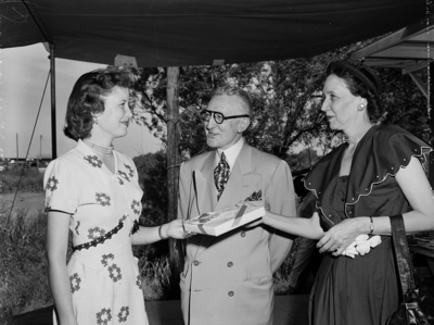 Miss Grace Cheery and Clyde Kirk, representing Cox's Department Store of Fort Worth, present 12 bottles of perfume, has a different scent for each month, to Miss Louise Livengood of Stamford, left, at the annual breakfast for cowgirl sponsors of the Texas Cowboy Reunion. Published in Fort Worth Star-Telegram, morning edition July 3, 1950.