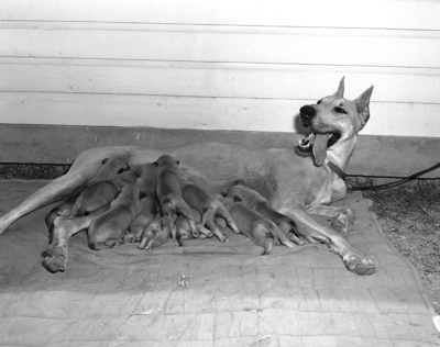 Image shows a 14 month old Great Dane with 10 puppies. Lady, produced a litter of 10 puppies, five male and five female. Owners, Mr. and Mrs. Rollene Dike of 2012 Chestnut, sold them for $50 each.