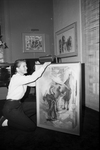 Fifth Avenue Art Gallery. Cynthia Brants adjust light over painting "The Blacksmith".
