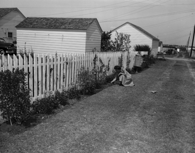 Image shows Mrs. B.P. Craft, 1120 E. Robert, in alley behind her home gardening. She devotes attention to the alley behind her home as she does to yard. The grounds around the Craft home represent the aims of Fort Worth's beautification program sponsored by the Chamber of Commerce and the Star-Telegram.