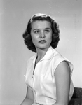 Image shows a bust shot of 16 year old Barbara Miller. She debut as the titled role as "Claudia" with the ability and stage presentation of a professional. A capacity crowd filled TCU's Little Theater to watch Dr. Walther Volbachs three-act play. Few knew of her stage debut since her performance as Claudia was flawless.
