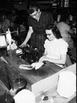 Cisco, Texas. Industry. Mrs. Ruth Livingston watches Mrs. Bobbie Mayhall sew work gloves.