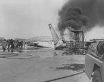 B-58 Hustler bomber in flames after it exploded on the Convair flight line, Fort Worth, Texas, 05/15/1959