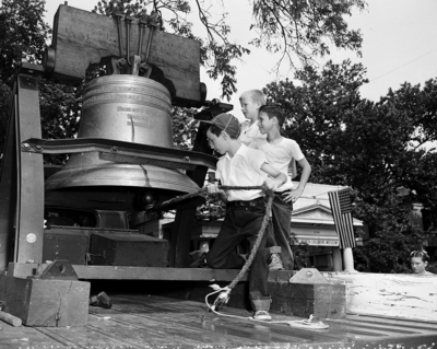 Image shows three boys ringing the Liberty Bell replica at the Fort Worth Children's Museum. The replica is being used in the independence savings bond campaign. The three boys, from left to right, Gregg Banner, Jim Gilliland and David Woolridge, are known as the Museum Patrol. The Museum Patrol assisted the reception committee and served as guides through the museum galleries.