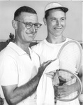Tennis aspirants, Bob Hardwicke Jr., left, and Paul Gregory. They can be seen standing next to each other. Hardwicke is holding a white towel in his hands and Gregory two tennis rackets.