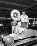 Soap Box Derby. Newton Fallis gets weighted in with racer by Ira S. Lewis.