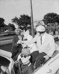 Coach Abe Martin gets kiss from Marilyn Turner as Mayor Tom McCann shakes his hand as they ride on the Oil Can Derby parade.