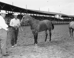 Jole Blon, shown here with her owner, Doyle Saul of Plainview, was the champion mare of the American Quarter Horse Show of the Texas Cowboy Reunion at Stamford. Published in Fort Worth Star-Telegram, evening edition July 1, 1950.
