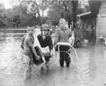 10/01/1959 flood - from left to right, Gregory Grove, Steven Grove, and Fred Edwards help neighbors rescue furniture in flooded Richland Hills. Three children can be seen standing in water up to the children's knees. There is a house of the right side of the photo. The child in the left and middle are wearing shorts, the child in the middle is wearing a military style helmet. The child on the right is wear boots.