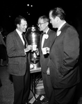 Dr. Jack R. Woolf, left, president of Arlington State College, serves coffee to Representatives Scott McDonald, center of Tarrant county and Robert Johnson of Dallas county during ceremonies honoring legislators of the two counties. Published in Fort Worth Star-Telegram morning edition October 25, 1959.