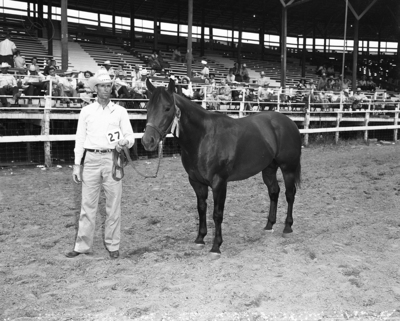 Buddy Dexter, owned by R. L. Underwood of Wichita Falls, shown here with C. H. Bowman of Wichita Falls, was named champion stallion of the American Quarter Horse Show at the Texas Cowboy Reunion at Stamford. Published in Fort Worth Star-Telegram, morning edition July 4, 1950.
