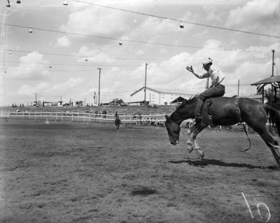 David Rushing of Abilene on K. C. Paint battles bareback broncs at the Texas Cowboy Reunion Rodeo. Published in Fort Worth Star-Telegram, morning edition July 5, 1950.